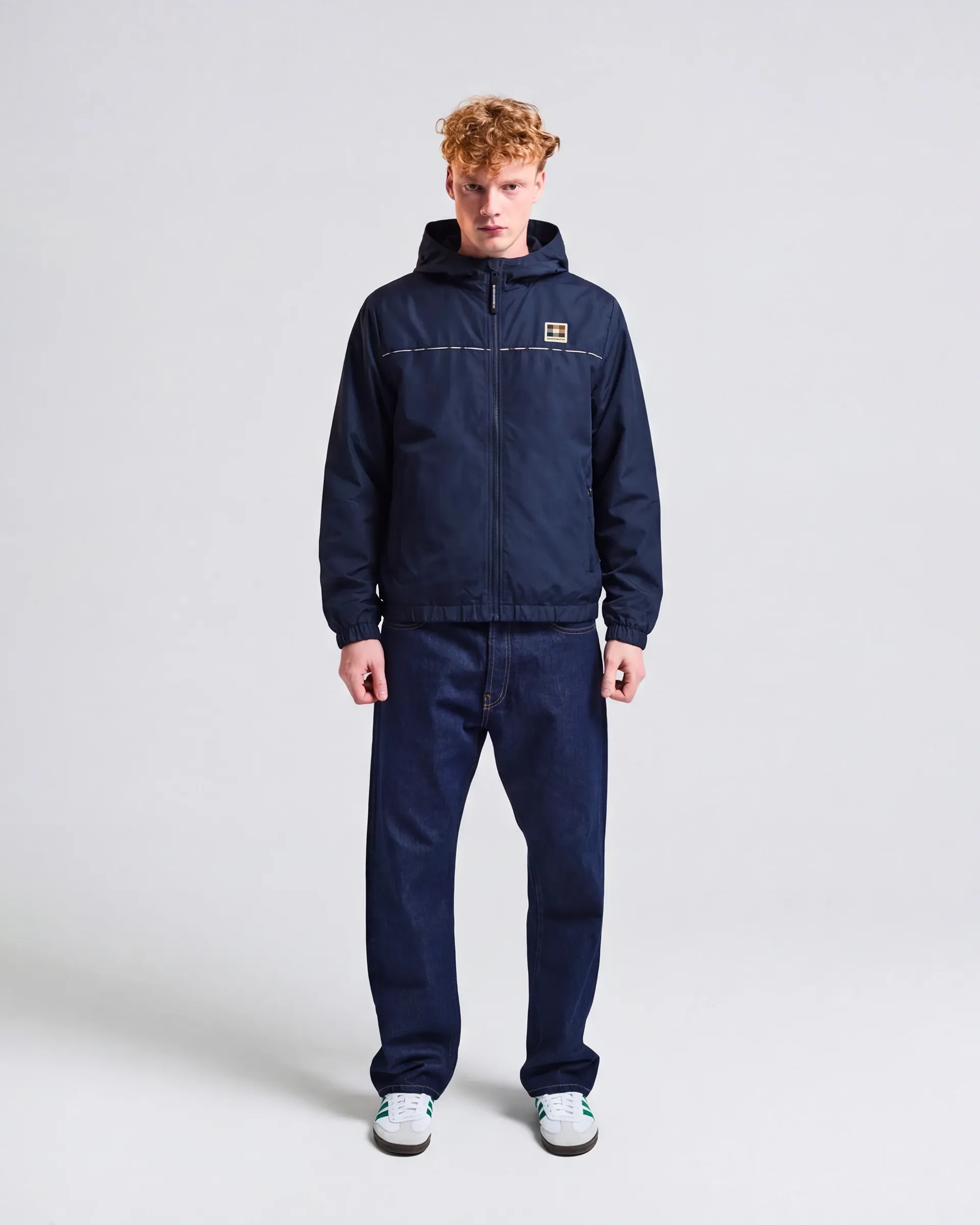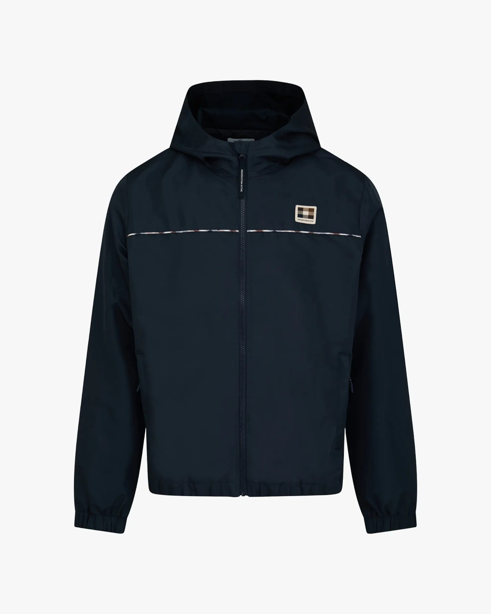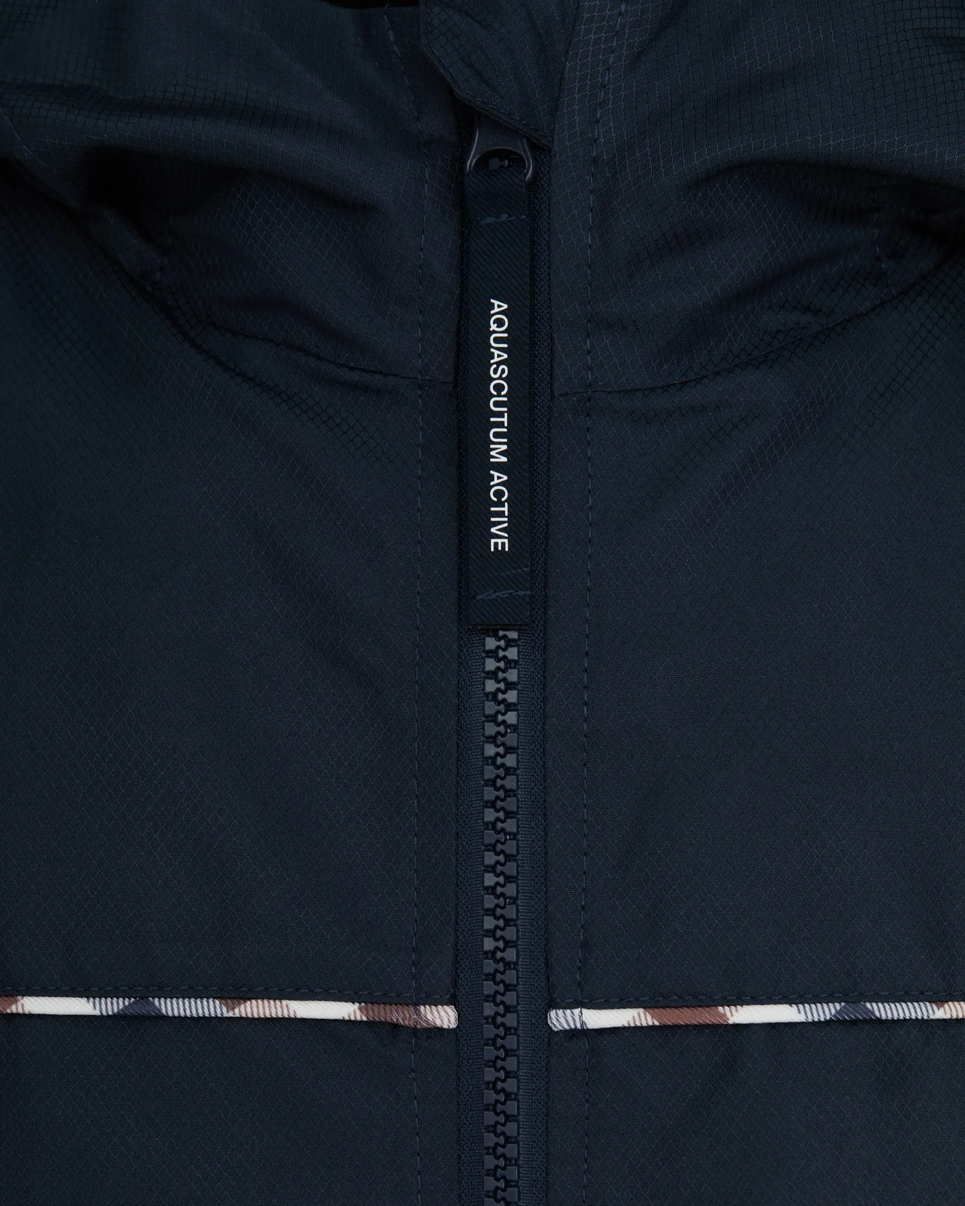 The design features a hood with internal nylon mesh lining, elastic tape finishing at cuffs and hem, and refined Club Check piping applied as a contrast detail. The Aquascutum Active small logo completes the look, delivering a clean and contemporary expression of the brand’s technical identity.
