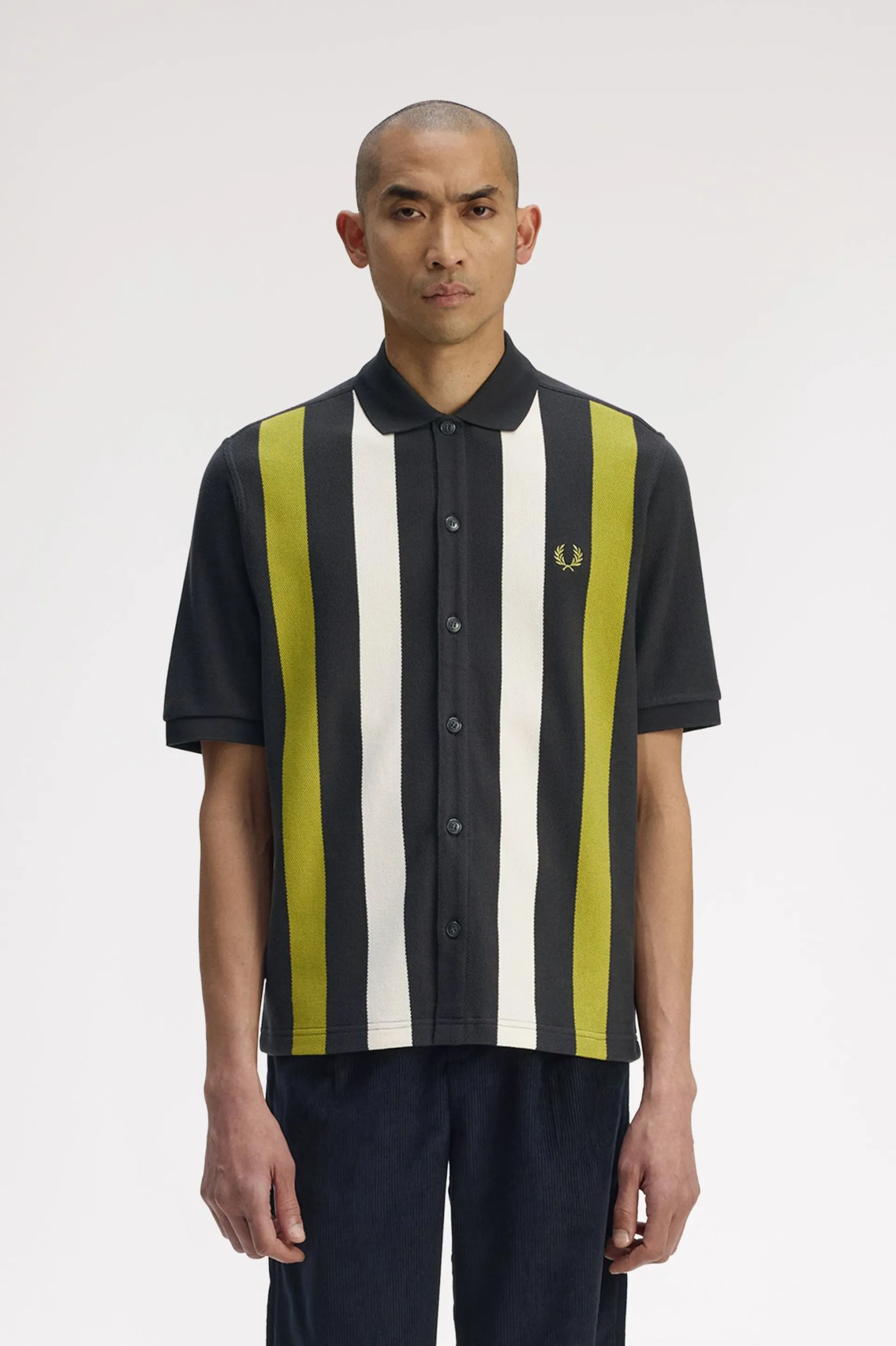 Bold vertical stripes in bright seasonal colours take their cue from the painted lines of the court and pitch. Our vertical stripe polo shirtis a nod to our sporting heritage, reimagined in the same high-performance cotton piqué of all our Fred Perry polo shirts, and finished with a smart placket with mock horn buttons. Play on.