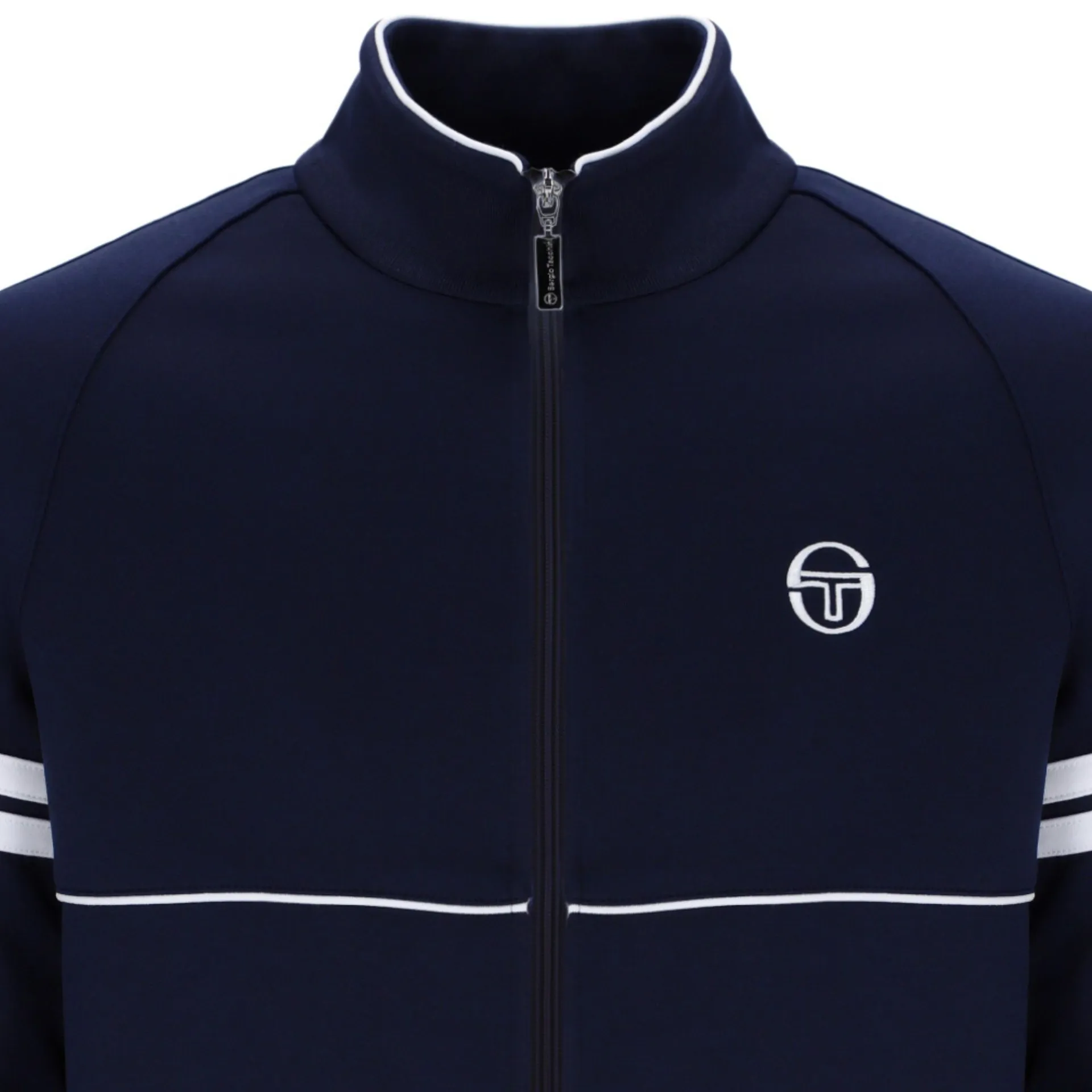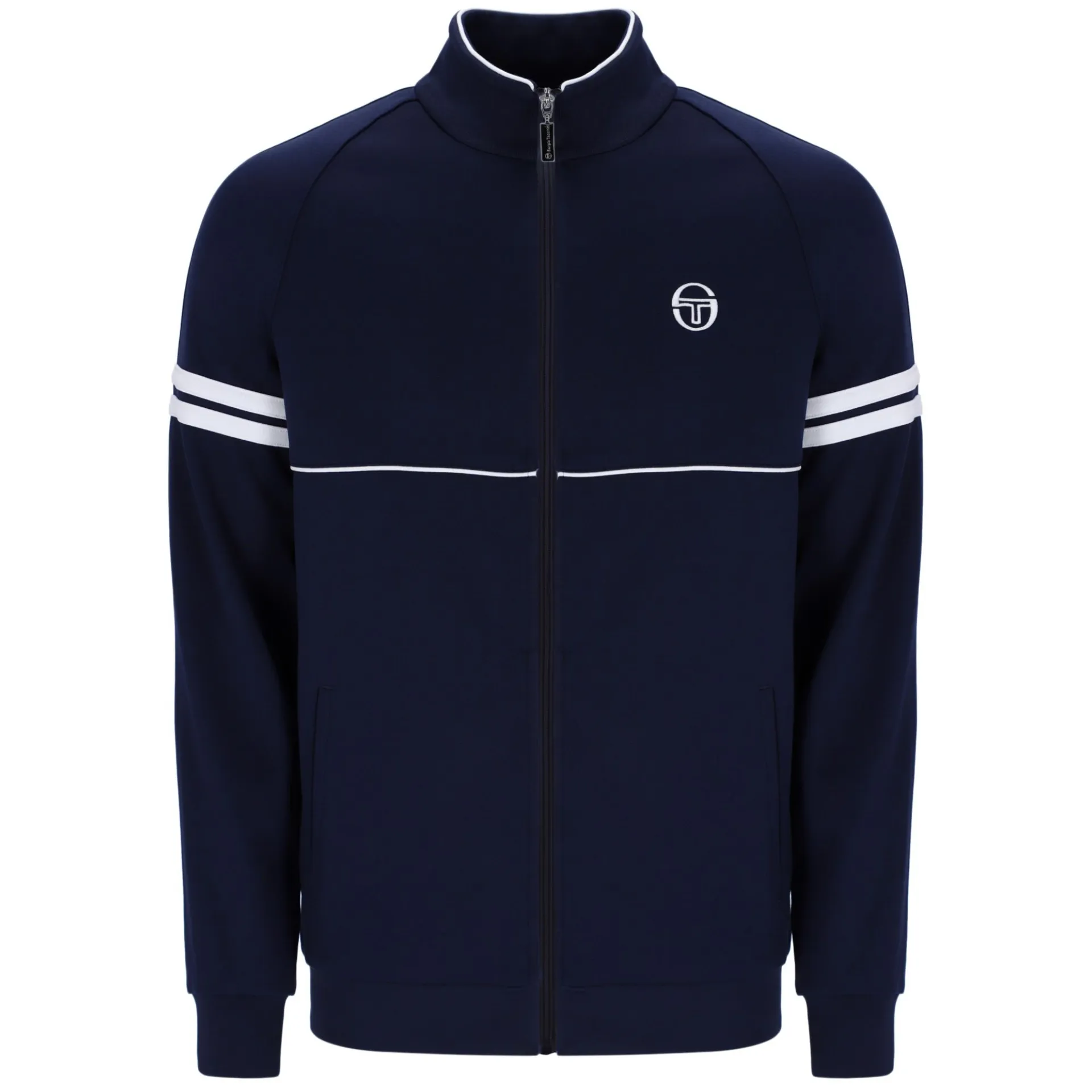 The Iconic Sergio Tacchini Orion track top was a favorite throughout the 80s, this retro zip-up features contrast piping across the chest and double stripes at the upper arms