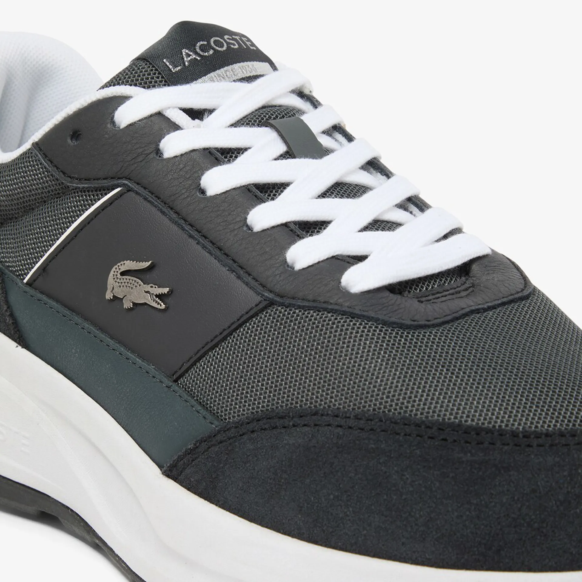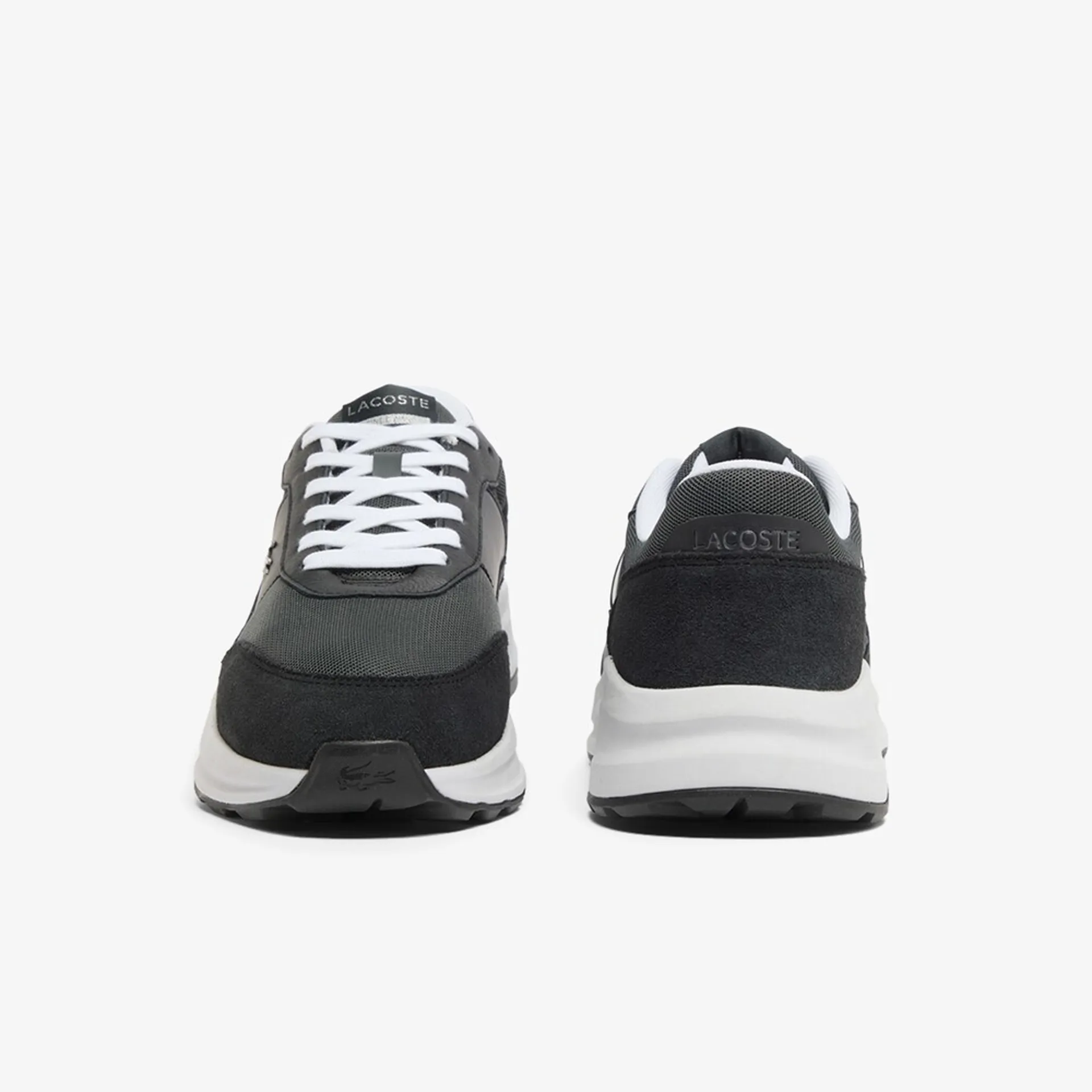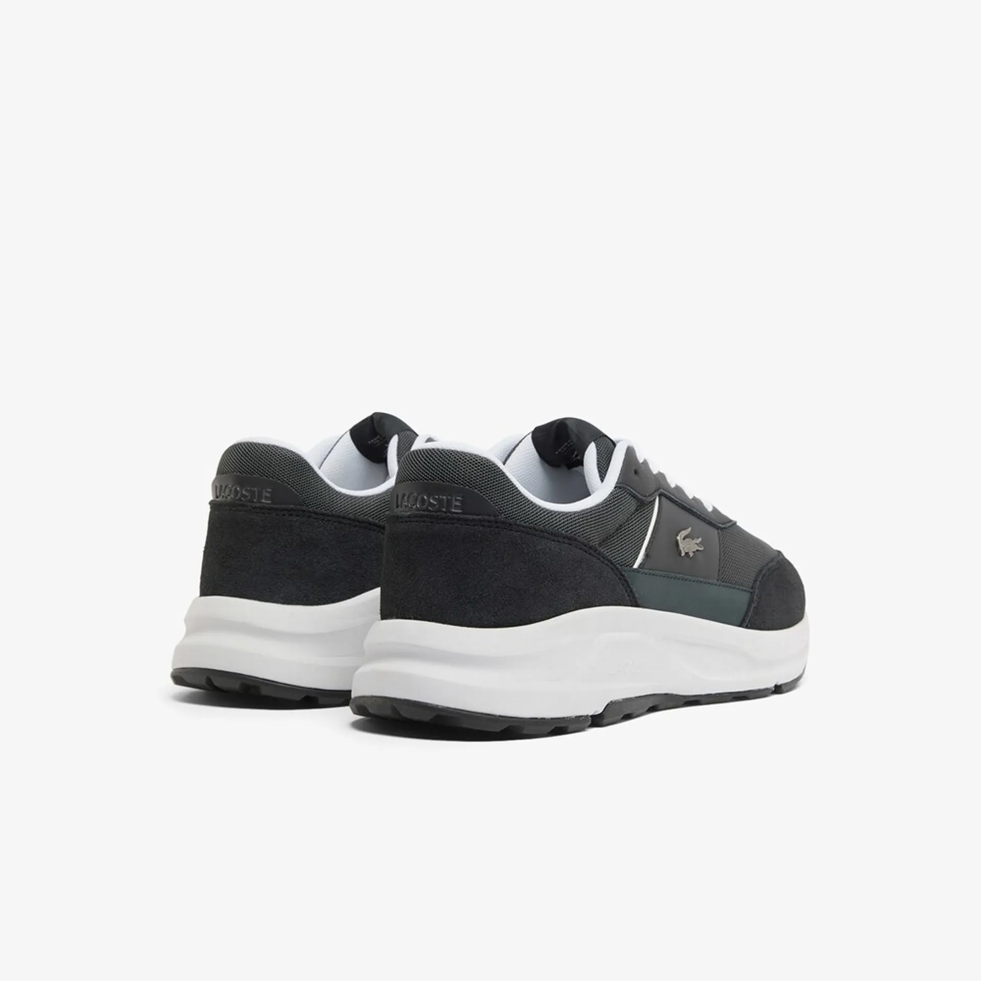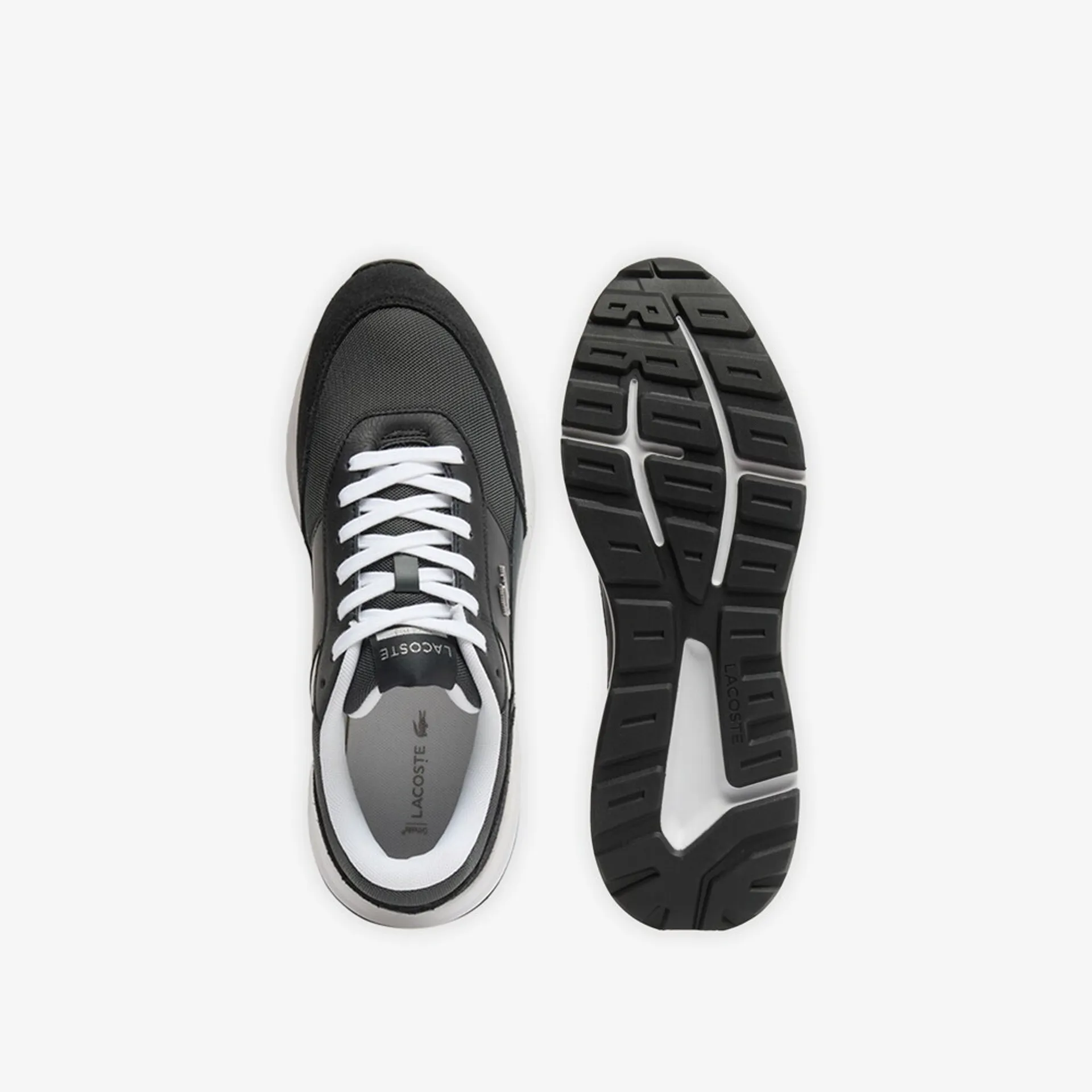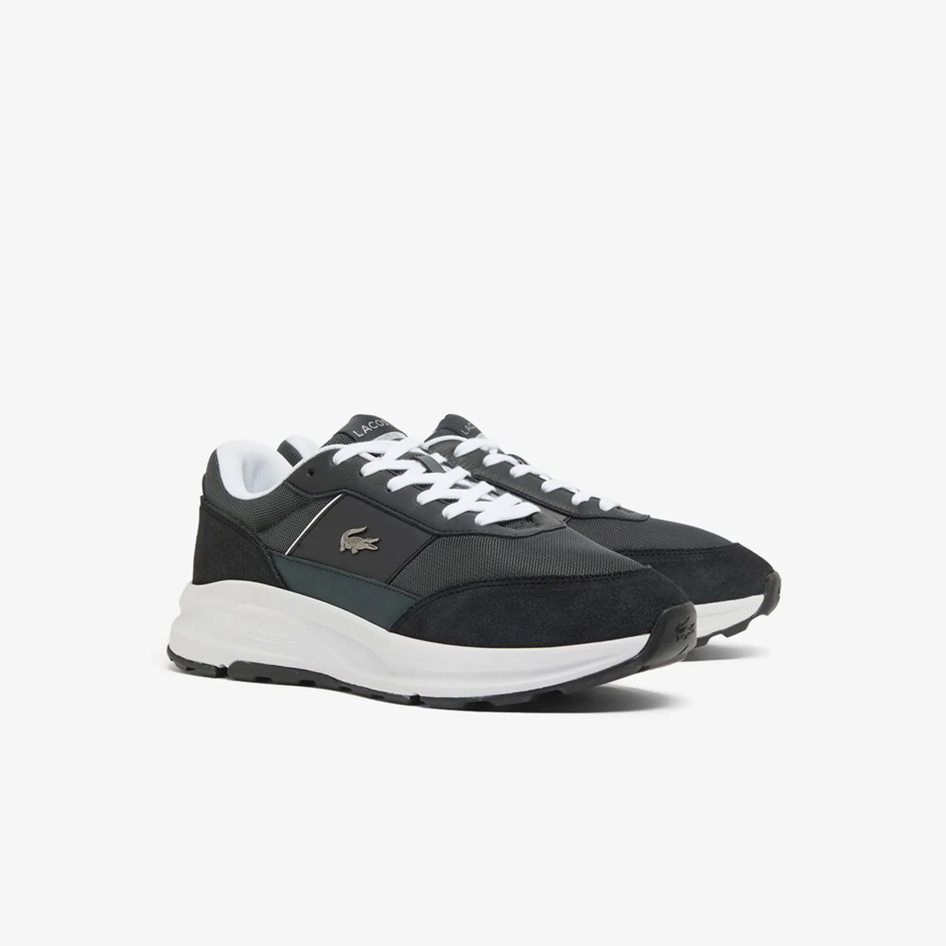 The Lacoste Run Set is a casual shoe with an active silhouette, featuring a textile upper and overlays in leather, suede, and synthetic materials.