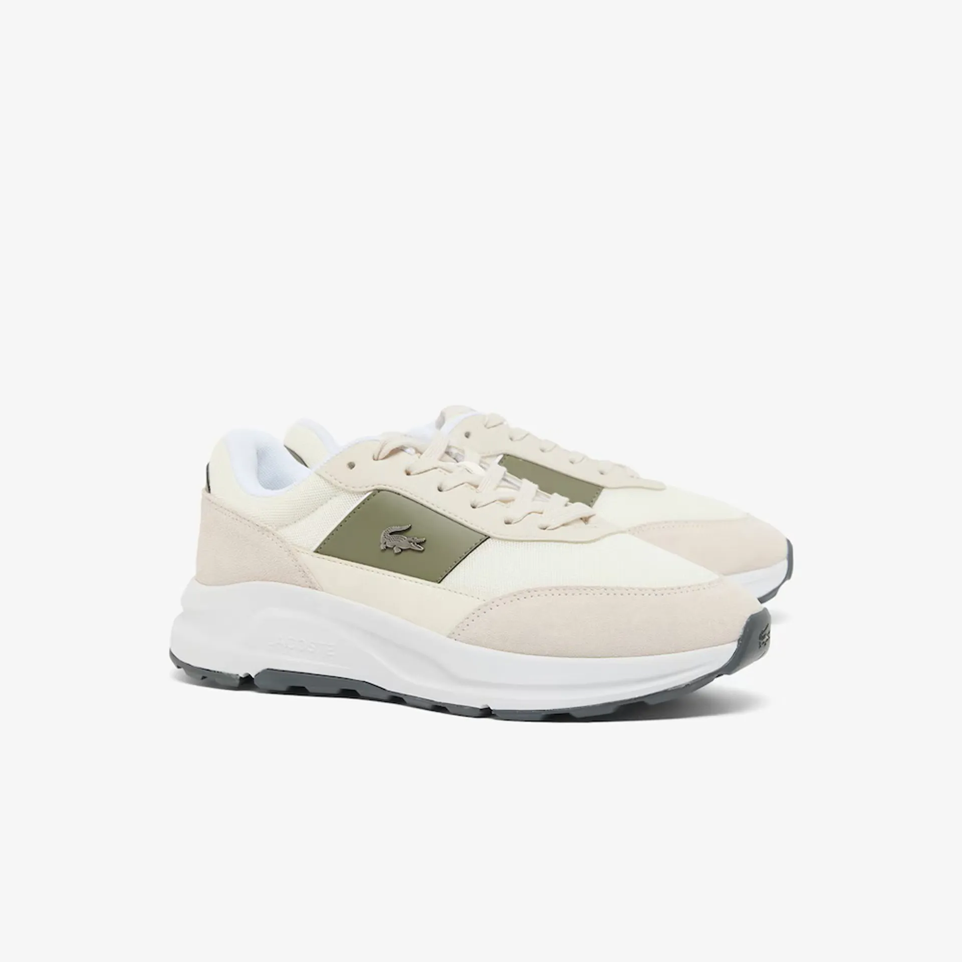 The Lacoste Run Set is a casual shoe with an active silhouette, featuring a textile upper and overlays in leather, suede, and synthetic materials.