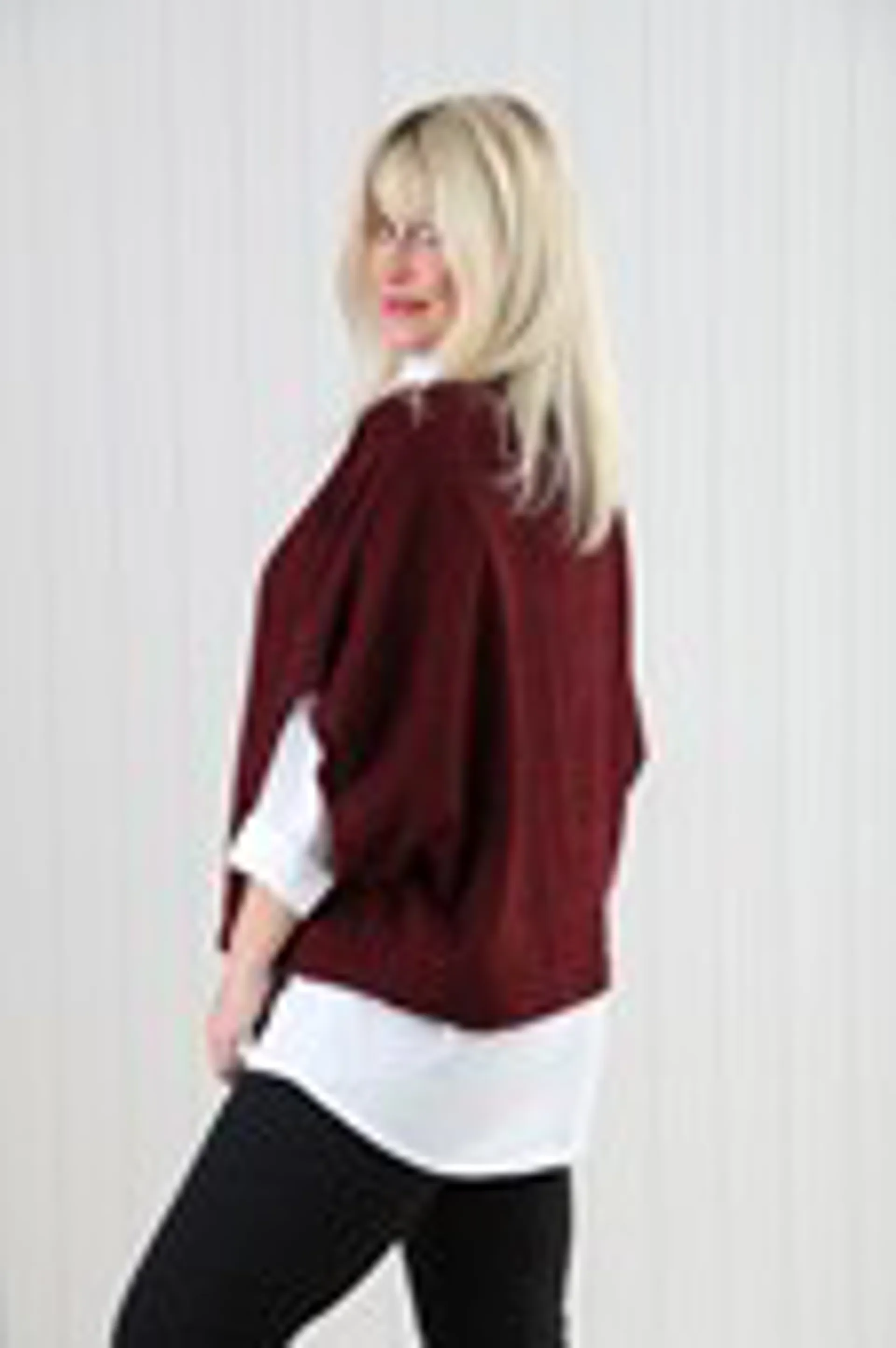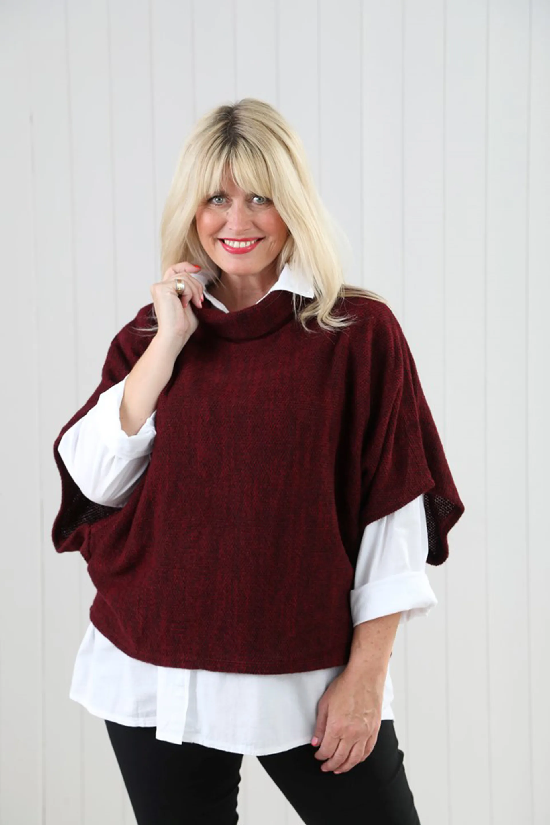 Question(s) answered about Goose Island cowl poncho top Bordeuax